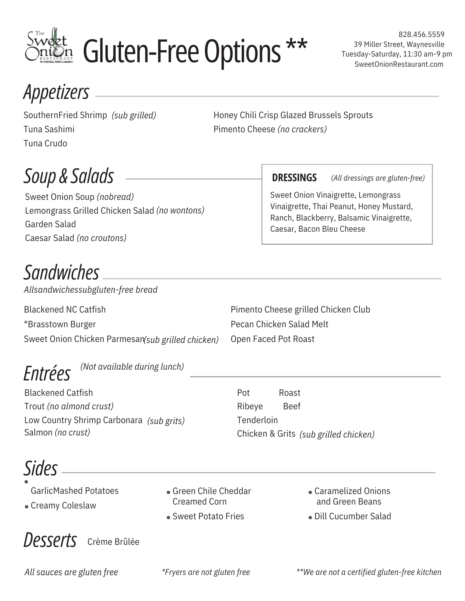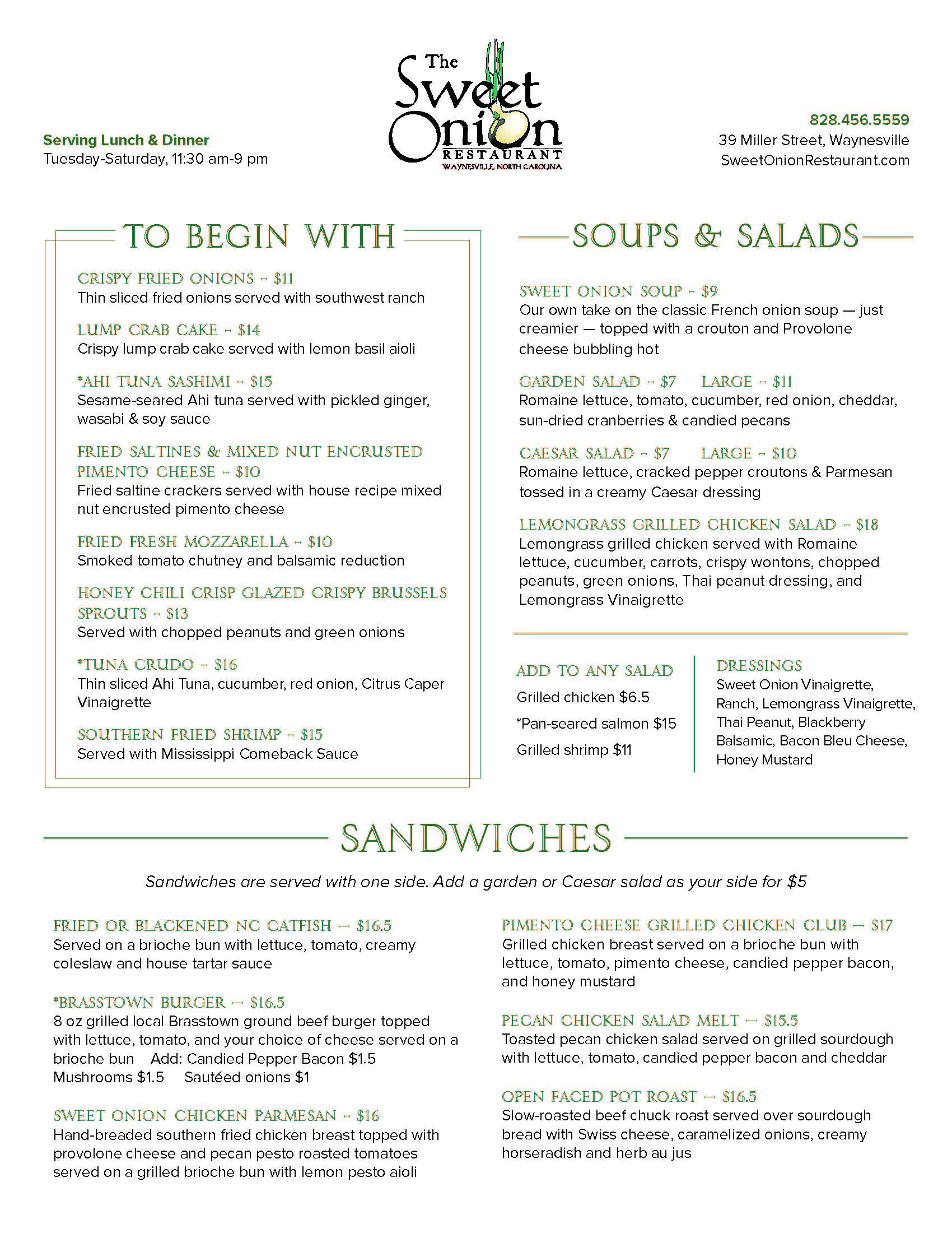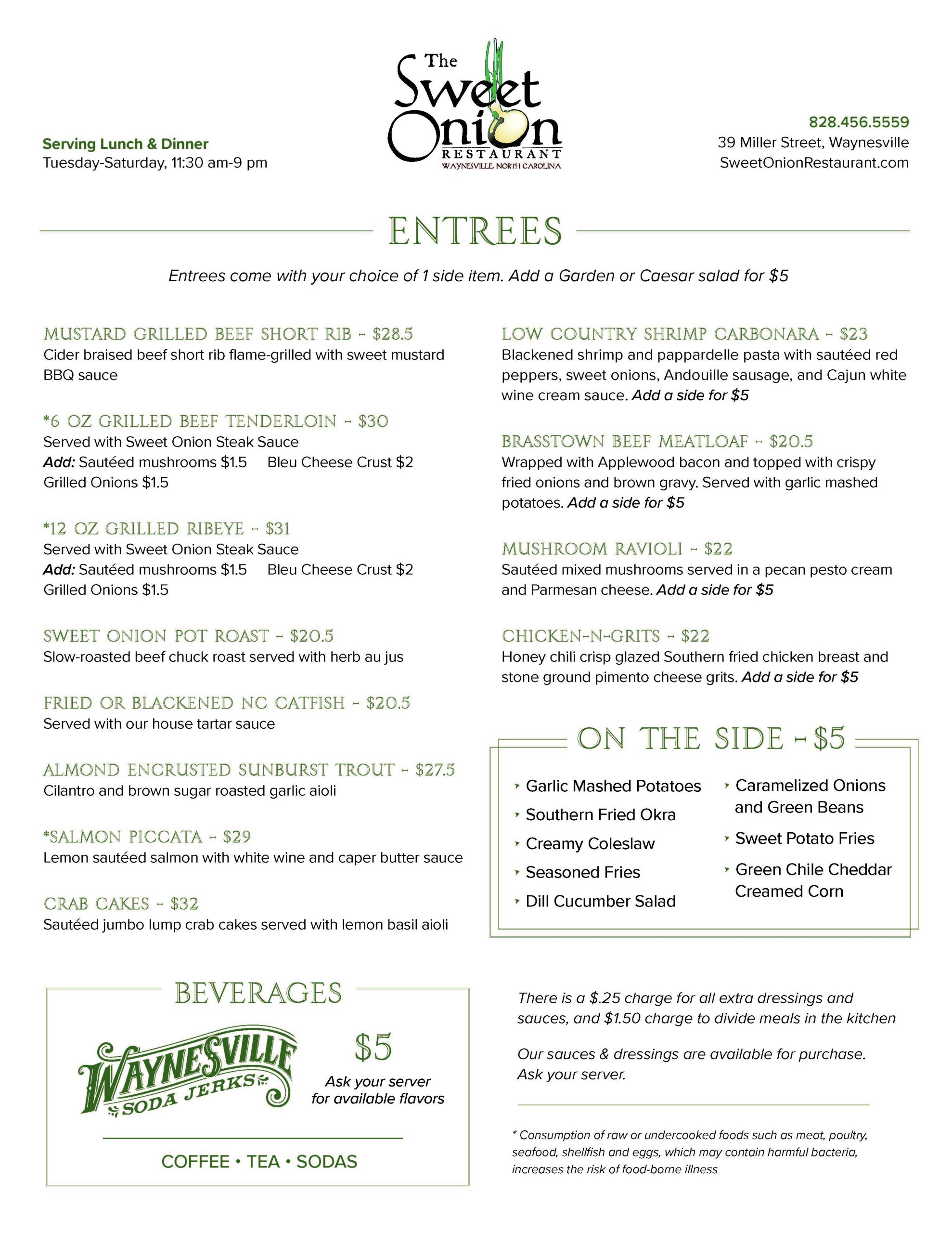 The Sweet Onion Restaurant offers a delightful blend of traditional Southern favorites and innovative dishes. Our menu features classics like Southern fried chicken, signature pastas, fresh mountain trout, and scrumptious house-made desserts, ensuring there’s something for everyone in the family.